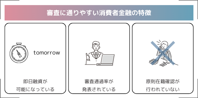 審査に通りやすい消費者金融には、3つの特徴があります。
