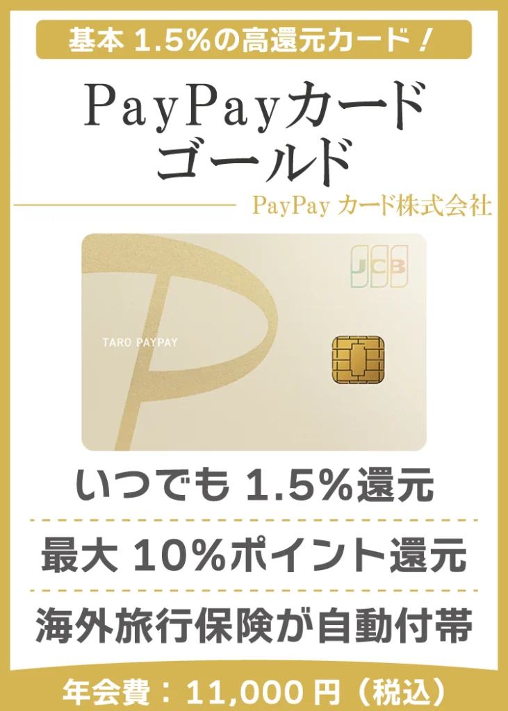 さらに、一部のゴールドカードは一般カードよりもポイント還元率が高く設定されていることもあります。たとえば、PayPayカードは一般カードだも1.0%と高還元ですが、ゴールドカードになると常に1.5%と更に還元率が高くなります。