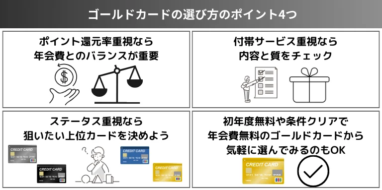 そこで当記事では、ゴールドカードの選び方を踏まえ、ポイント還元率、特典と付帯サービス、ステータス性、年会費の観点からおすすめのゴールドカードを解説します。
