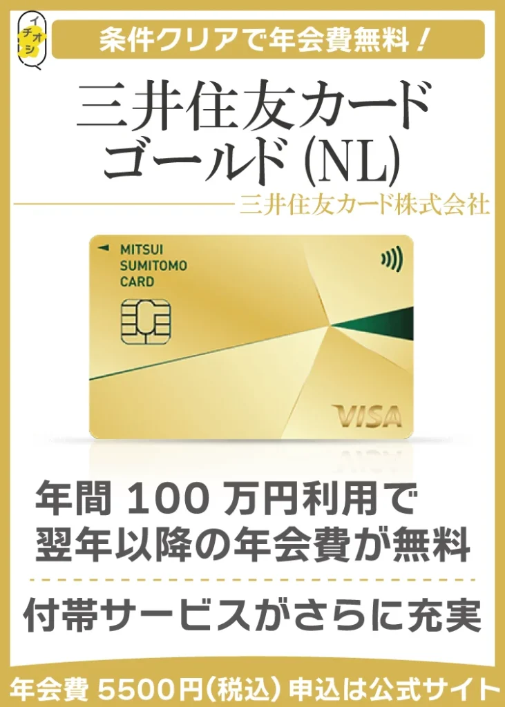 三井住友カード ゴールド(NL)は年間100万円決済で翌年以降の年会費無料&1万ポイントプレゼント!