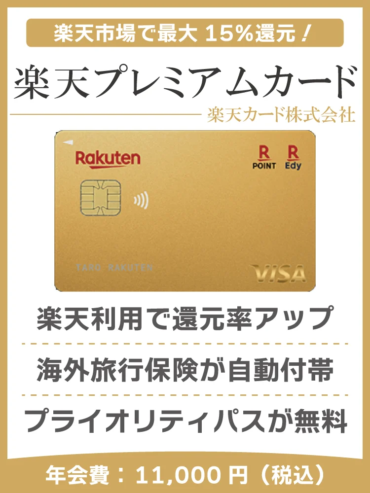 また、楽天プレミアムカードには、より豪華なVIP空港ラウンジに入場できる「プライオリティ・パス」が年会費無料で付帯します。プライオリティ・パスが無料付帯するのは多くの場合、更に上位のプラチナカードですが、楽天プレミアムカードであれば11,000円(税込)の年会費で無料付帯されます。