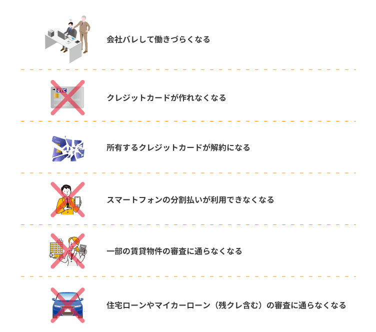 また、信用情報が傷つくため、クレジットカードの審査やスマートフォンの分割契約も難しくなります。