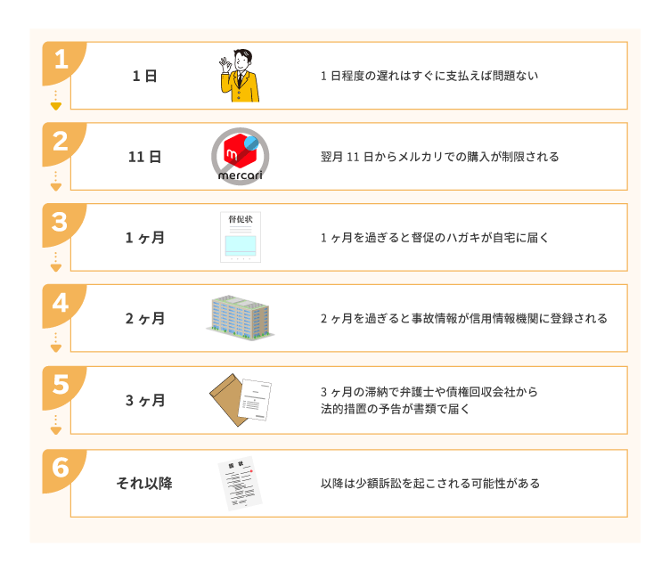 | 1ヶ月以降 | ・督促ハガキが来る ・メルペイアカウントの利用停止 |