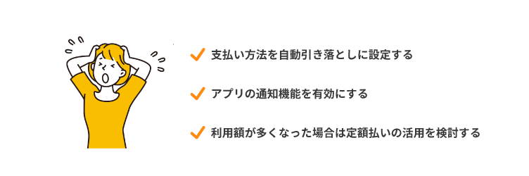 ここでは、今後メルペイスマート払いを計画的に利用するためにも、支払いで送れないコツを紹介します。メルペイスマート払いで支払い遅れを防ぐコツは以下のとおりです。