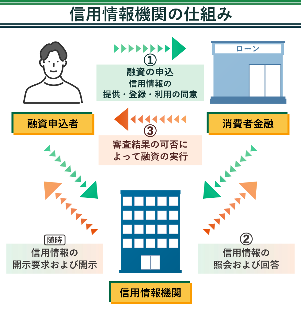 ローンやクレジットを申し込むと、金融会社は信用情報機関の管理する信用情報を参照して、消費者の返済能力を審査します。ローンやクレジットの利用や支払いを行なった際には、支払状況や残債額などが信用情報に記録されます。