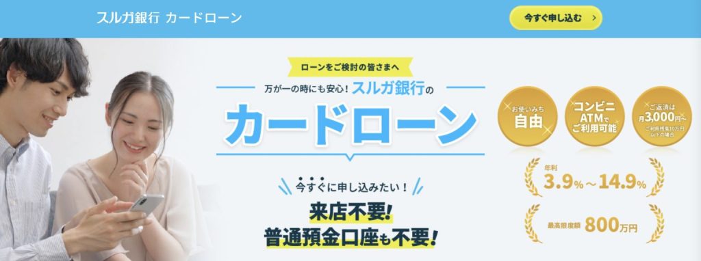 金利については、大手消費者金融のカードローンが18%程度を上限とすることが多いなかで、スルガ銀行では3.9〜14.9%と低めの設定になっています。