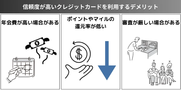 信頼度の高いクレジットカードを利用する場合、以下のようなデメリットがあります。