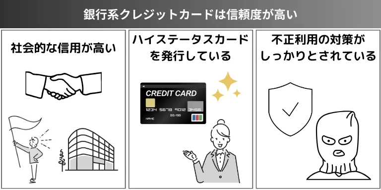 銀行は社会的に信用が高いため、発行されるクレジットカードの信頼度も高いです。